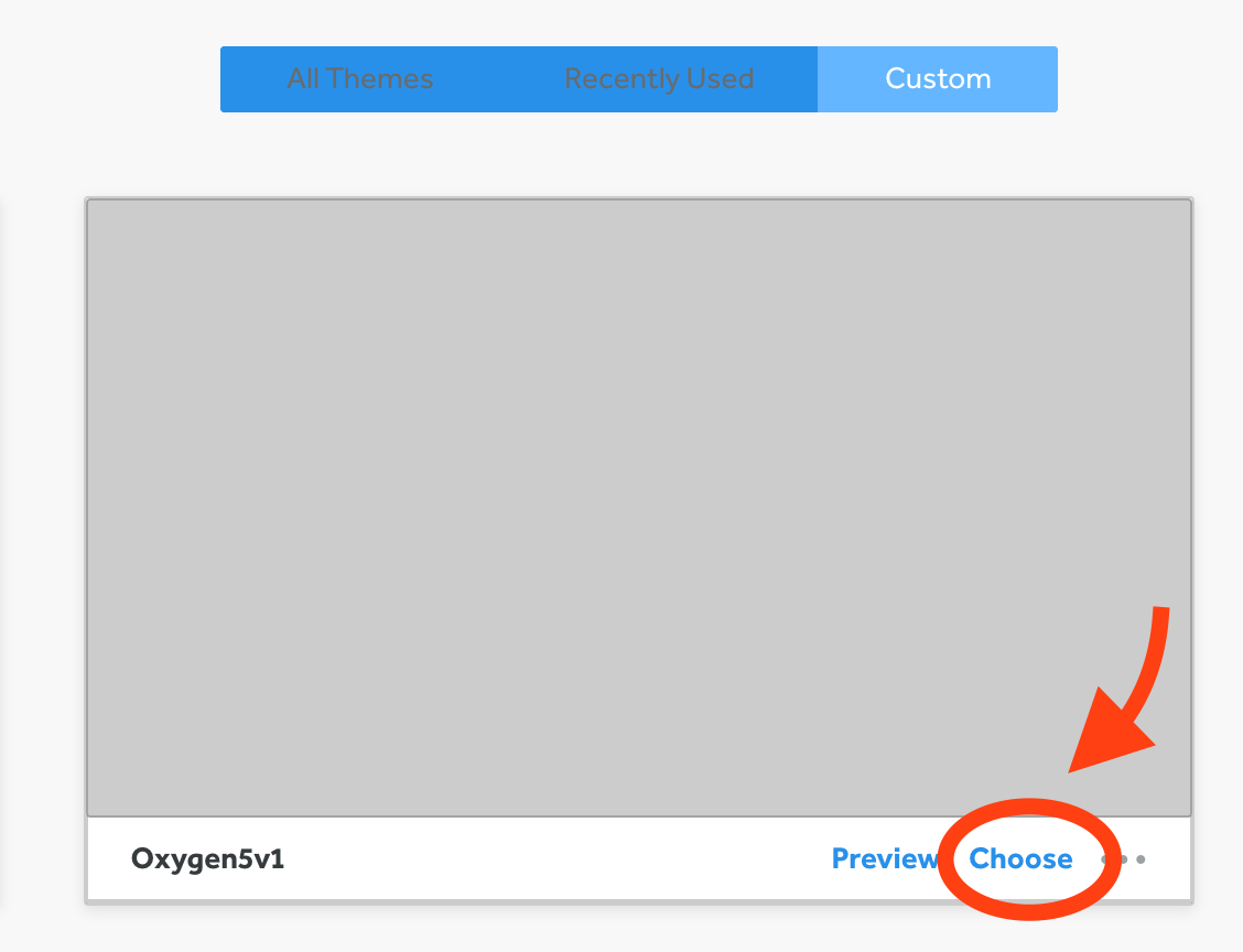 After the theme is done uploading, you will be taken to the "custom themes" page where you should see the Oxygen theme. Click on the blue "choose" button. That's it! From now on, your Oxygen theme will live here, in the custom themes section of your theme library. You will be taken to your Weebly website with Oxygen applied. But we're not done yet--continue reading below.