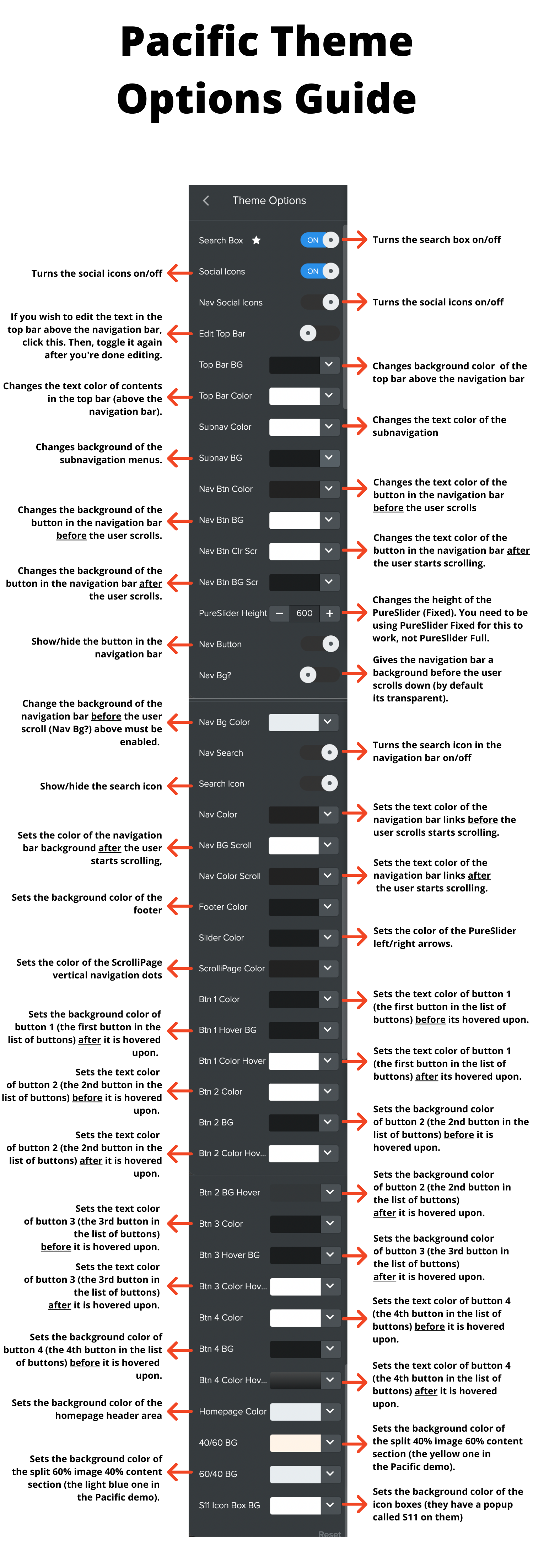 Changing the navigation colors is critical for establishing your brand, and Pacific lets you do just this. In the "theme options" panel, you'll see four color options that have to do with the navigation. They are "Nav Color", "Nav BG", "Nav Color Scroll."